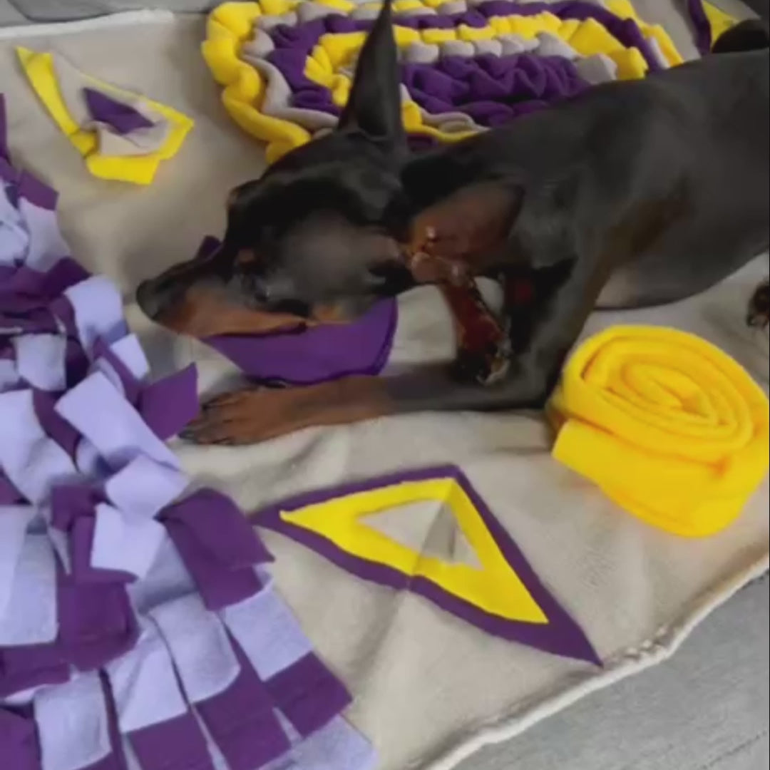 El objetivo de esta alfombrilla de olfateo es esconder alimento o premios entre las telas para que el perro los detecte y se divierta buscándolos.